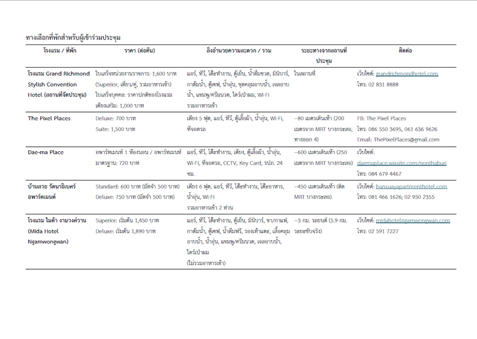 ผู้เข้าร่วมประชุมโปรดทำการสำรองห้องพักโดยตรงกับ โรงแรมแกรนด์ ริชมอนด์ ภายในวันที่ 15 ตุลาคม 2568